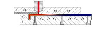 Noch bevor die Schmelze die ca. 100 mm lange, die Formfüllung bestimmende, variotherm beheizte Vorlaufzone verlässt, beginnt sich der Schlitten entgegen der Spritzrichtung zu bewegen, wie dies die schematische Darstellung des Füllvorgangs im Schnitt durch das Werkzeug zeigt. Der Einspritzvorgang läuft primär druckgeregelt ab, wobei Fließfrontgeschwindigkeit und Schlittenbewegung harmonisiert werden. Damit eilt der Anschnitt der Fließfront hinterher. Somit kann zu jedem Zeitpunkt des Vorgangs ein konstant niedriger Einspritzdruck und auch durch den gleichmäßigen Abkühlvorgang ein stabiler Nachdruck erreicht werden. Bei konstantem Druck und niedrigen Scherraten werden auch sehr lange Kavitäten gleichmäßig und ohne Bindenähte gefüllt.