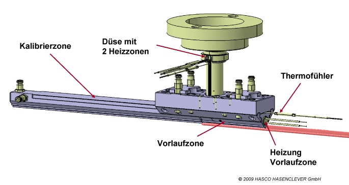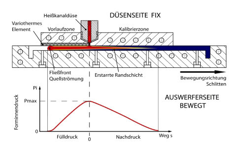 Schlittengeschwindigkeit und Einspritzprofil werden über die Bauteillänge durch Vorgabewerte und Geschwindigkeitsprofile gesteuert. Regelgrößen sind dabei der Profilquerschnitt und die Bauteildicke, die in Abhängigkeit vom Spritzmaterial und den Prozesstemperaturen die Abkühlgeschwindigkeit und damit die Schlittengeschwindigkeit bestimmen. Die thermoplastische Schmelze kühlt von der Fließfront weg an der Formnestoberfläche ab und unterliegt einem gleichmäßigen Nachdruckverlauf, bis die Schmelze über die gesamte Wandstärke erstarrt ist. Je nach Viskosität der Schmelze, Füllgeschwindigkeit und Bauteilwandstärke können Fülldrücke und damit auch Nachdrücke, im Bereich von etwa 50 bar bis 300 bar gewählt werden.